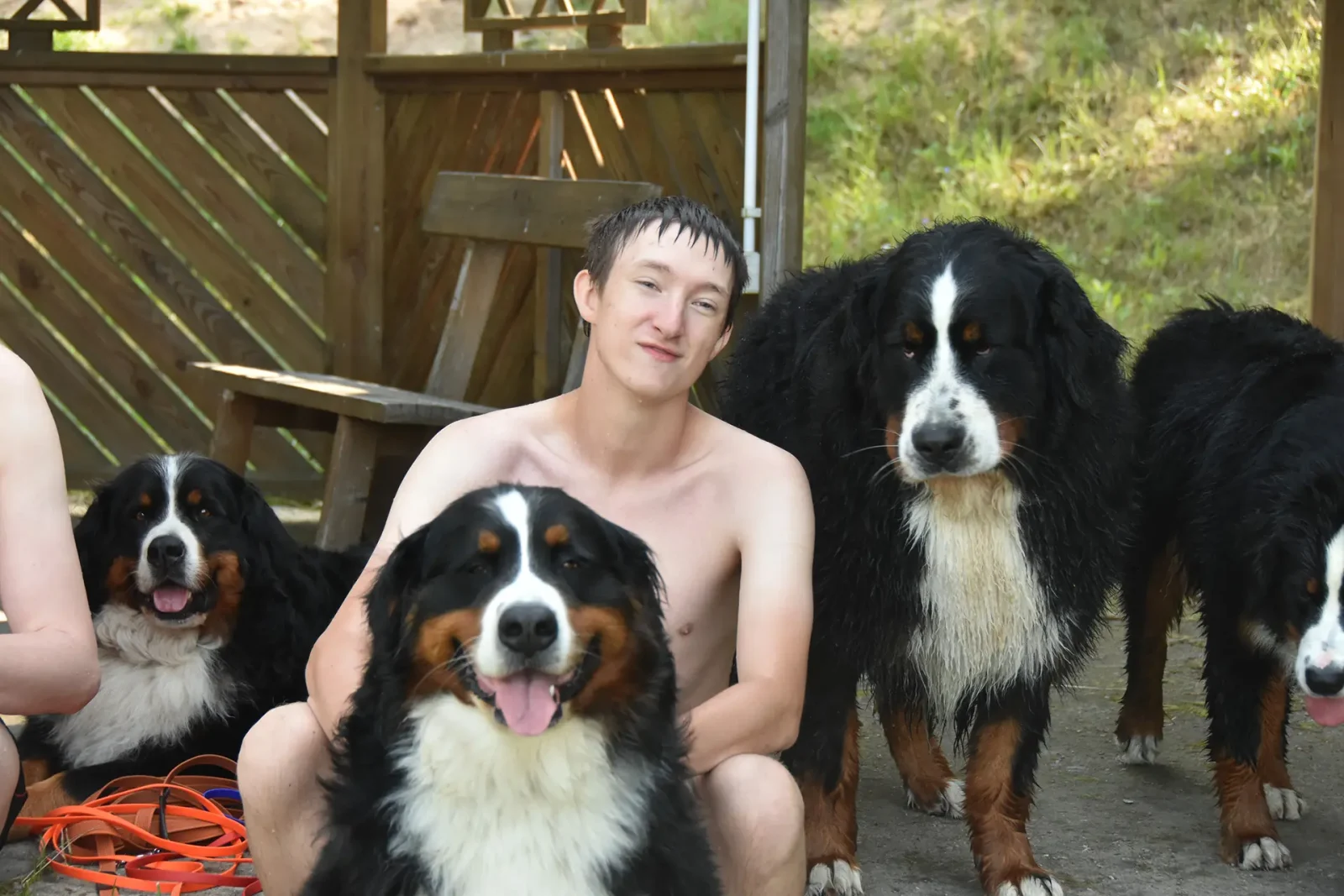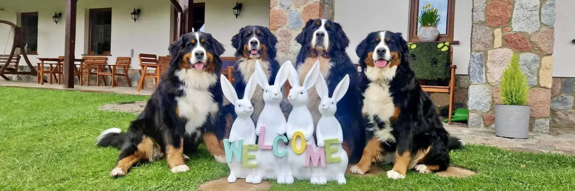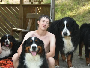W 2009 roku, w czasie wycieczki w górach, chłopcy z „Tęczowego Domu” dostali od ś.p. O. Huberta Kasztelana OCist. szczenię – suczkę rasy Berneński Pies Pasterski. W drodze do domu Sylwek nazwał ją Bella. I tak się zaczęło… W 2012 roku dołączyła do Belli – dla towarzystwa – Xara, która uzyskała uprawnienia hodowlane FCI i stała się początkiem zarejestrowanej w Związku Kynologicznym w Polsce (członka FCI) hodowli: Z MAZURSKIEJ ZAGRODY FCI. Xara była matką 2 miotów, z których zostały z nami Abi i Bonita, Championki Polski i Litwy. Córką Bonity była niesamowita Carina, matka miotu D (‘diamentów”). Pożegnaliśmy ją w sierpniu 2025 r. W sierpniu 2024 r. pożegnaliśmy Zgredka, niezwykłego psa w typie rasy Szpic Norweski (Elkhund czarny), który od początku budowy farmy sam do nas przyszedł, „zapisał się na stróża”  i odtąd już z nami pozostał, wiernie strzegąc gospodarstwa i swojego małego „haremu”.