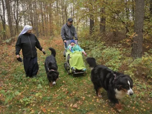 Hodujemy psy przede wszystkim z myślą o pracy z niepełnosprawnymi mieszkańcami „Tęczowego Domu” i uczniami Szkół Specjalnych prowadzonych przez Zgromadzenie. Psy jeżdżą do Ełku, gdzie pod okiem wykwalifikowanych kynoterapeutów uczestniczą w zajęciach edukacyjnych i terapeutycznych. Ich obecność pomaga dzieciom skupić uwagę, nawiązać kontakt z otoczeniem, wyciszyć się. Motywuje do aktywności. Zajęcia są prowadzone indywidualnie lub w bardzo małych grupach. Naczelną zasadą w zajęciach jest zachowanie komfortu zarówno dziecka, jak zwierzęcia.